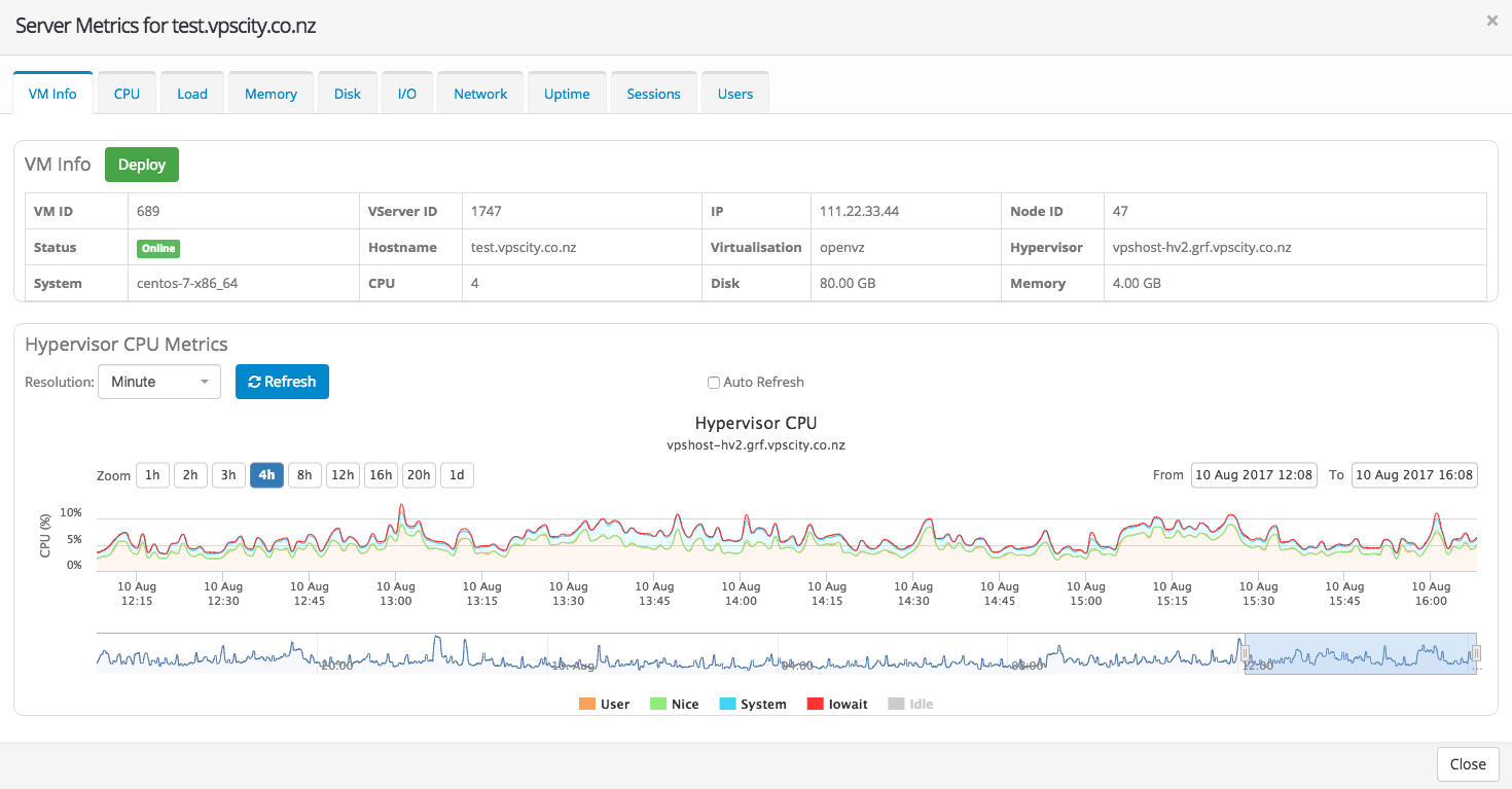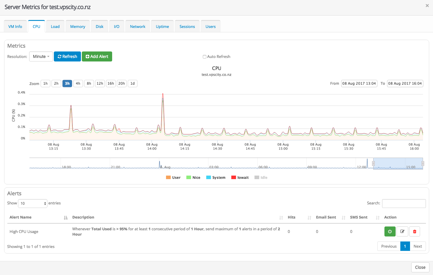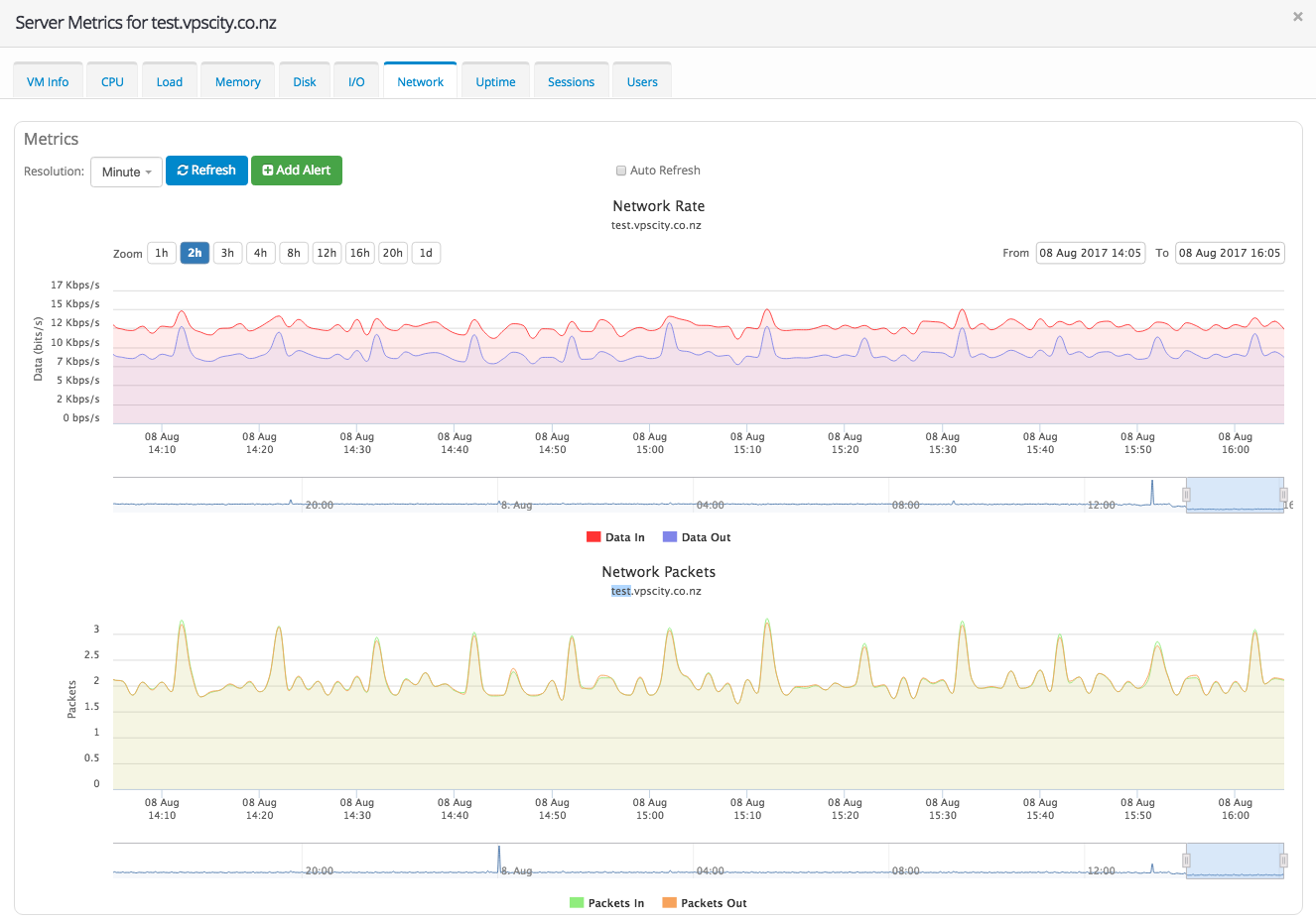 VpsCity now enables you to monitor and track important server resource usage information (CPU, Memory, Network, Disk, Load, I/O, Uptime, Sessions and Users) and you are also able to set notifications and actions based on metrics via our Server Metrics tool.